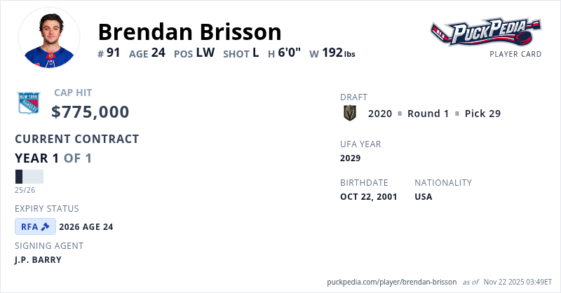 Brendan Brisson is signed to a 1 year, $775,000 contract with a cap hit of $775,000 per season, playing for the New York Rangers. His contract expires at the end of the 2025-26 season, making Brisson a Restricted Free Agent.