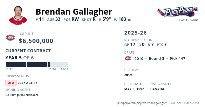 Brendan Gallagher is signed to a 6 year, $39,000,000 contract with a cap hit of $6,500,000 per season, playing for the Montreal Canadiens. His contract expires at the end of the 2026-27 season, making Gallagher an Unrestricted Free Agent.