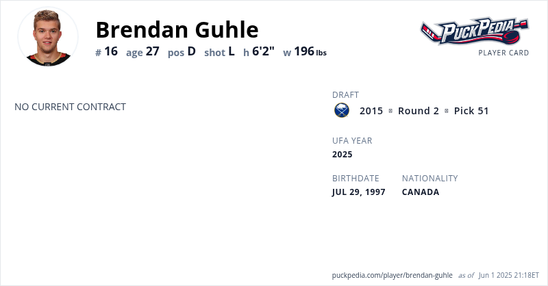 Brendan Guhle is an Unrestricted Free Agent (No Qualifying Offer). His last contract was 2 years, $1,600,000 with a cap hit of $800,000 per season. It expired at the end of the 2021-22 season.