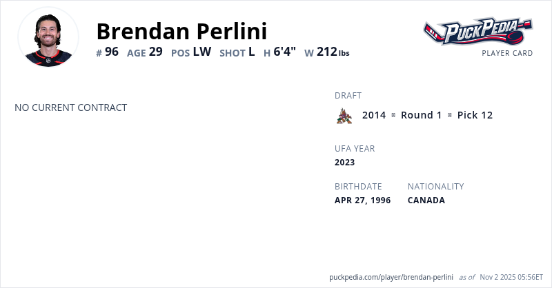 Brendan Perlini is an Unrestricted Free Agent (No Qualifying Offer). His last contract was 1 year, $750,000 with a cap hit of $750,000 per season. It expired at the end of the 2021-22 season.