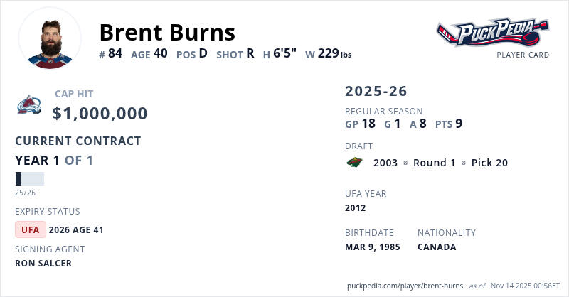 Brent Burns is signed to a 1 year, $1,000,000 contract with a cap hit of $1,000,000 per season, playing for the Colorado Avalanche. His contract expires at the end of the 2025-26 season, making Burns an Unrestricted Free Agent.