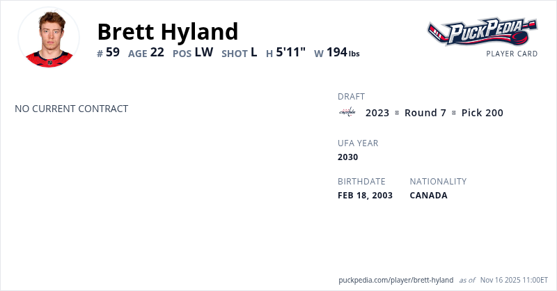 | 2021-22 | 18 | WHL | Brandon Wheat Kings | 61 | 13 | 16 | 29 | 65 | Playoffs | 6 | 0 | 1 | 1 | 0 | ||||||||||||||||