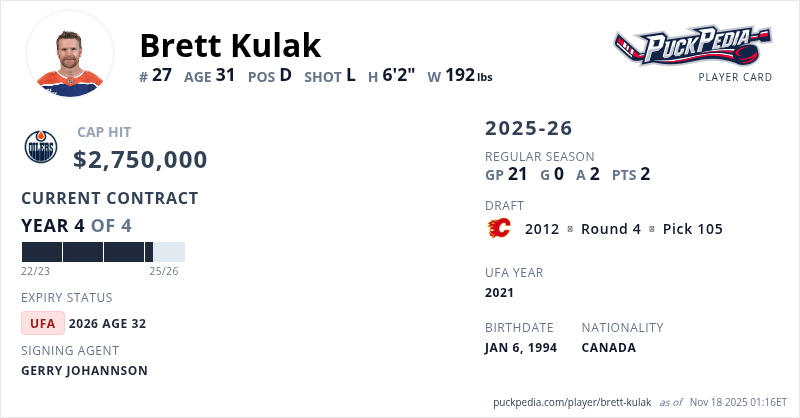 Brett Kulak is signed to a 4 year, $11,000,000 contract with a cap hit of $2,750,000 per season, playing for the Edmonton Oilers. His contract expires at the end of the 2025-26 season, making Kulak an Unrestricted Free Agent.