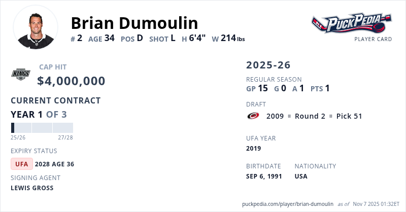 Brian Dumoulin is signed to a 3 year, $12,000,000 contract with a cap hit of $4,000,000 per season, playing for the Los Angeles Kings. His contract expires at the end of the 2027-28 season, making Dumoulin an Unrestricted Free Agent.