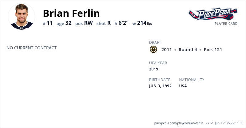 Brian Ferlin is an Unrestricted Free Agent (No Qualifying Offer). His last contract was 1 year, $700,000 with a cap hit of $700,000 per season. It expired at the end of the 2017-18 season.