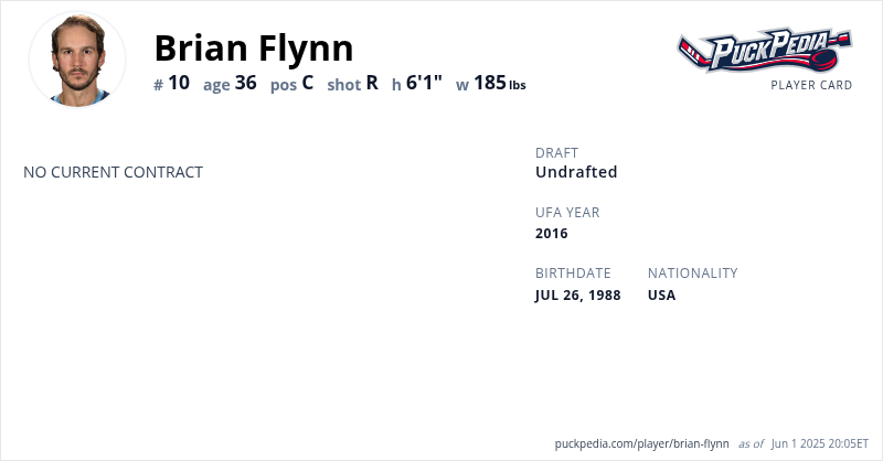 Brian Flynn is an Unrestricted Free Agent. His last contract was 1 year, $750,000 with a cap hit of $750,000 per season. It expired at the end of the 2021-22 season.