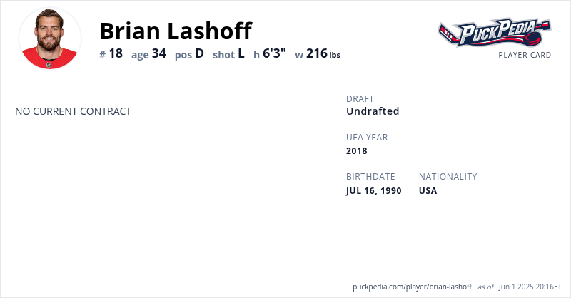 Brian Lashoff is an Unrestricted Free Agent. His last contract was 1 year, $750,000 with a cap hit of $750,000 per season. It expired at the end of the 2021-22 season.