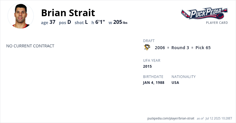 Brian Strait is an Unrestricted Free Agent. His last contract was 2 years, $1,350,000 with a cap hit of $675,000 per season. It expired at the end of the 2019-20 season.