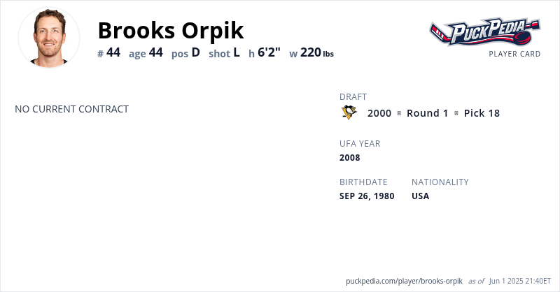 Brooks Orpik is an Unrestricted Free Agent. His last contract was 1 year, $1,000,000 with a cap hit of $1,000,000 per season. It expired at the end of the 2018-19 season.