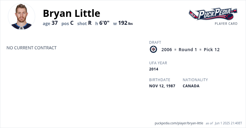Bryan Little is an Unrestricted Free Agent. His last contract was 6 years, $31,749,996 with a cap hit of $5,291,666 per season. It expired at the end of the 2023-24 season.