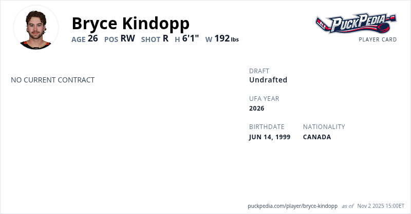 Bryce Kindopp is an Unrestricted Free Agent (No Qualifying Offer). His last contract was 3 years, $2,775,000 with a cap hit of $925,000 per season. It expired at the end of the 2022-23 season.