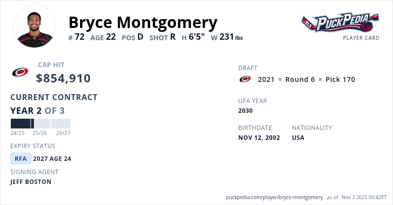 Bryce Montgomery is signed to a 3 year, $2,564,730 contract with a cap hit of $854,910 per season, playing for the Carolina Hurricanes. His contract expires at the end of the 2026-27 season, making Montgomery a Restricted Free Agent.