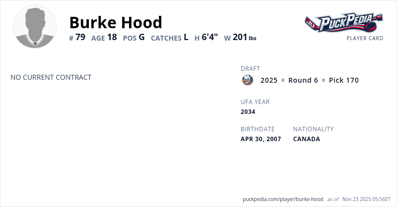 | 2024-25 | 17 | WHL | Vancouver Giants | 42 | 3.13 | 0.910 | 0 | Playoffs | 5 | 6.4 | 0.863 | 0 | ||||||||||||||||||