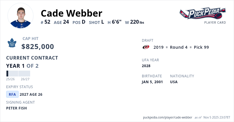 Cade Webber is signed to a 2 year, $1,650,000 contract with a cap hit of $825,000 per season, playing for the Toronto Maple Leafs. His contract expires at the end of the 2026-27 season, making Webber a Restricted Free Agent.