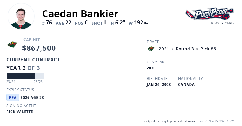 Caedan Bankier is signed to a 3 year, $2,602,500 contract with a cap hit of $867,500 per season, playing for the Minnesota Wild. His contract expires at the end of the 2025-26 season, making Bankier a Restricted Free Agent.