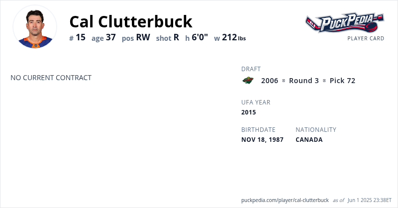 Cal Clutterbuck is an Unrestricted Free Agent. His last contract was 2 years, $3,500,000 with a cap hit of $1,750,000 per season. It expired at the end of the 2023-24 season.