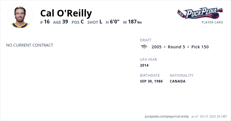 Cal O'Reilly is an Unrestricted Free Agent. His last contract was 2 years, $1,400,000 with a cap hit of $700,000 per season. It expired at the end of the 2018-19 season.