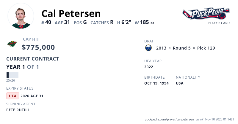 Cal Petersen is signed to a 1 year, $775,000 contract with a cap hit of $775,000 per season, playing for the Minnesota Wild. His contract expires at the end of the 2025-26 season, making Petersen an Unrestricted Free Agent.