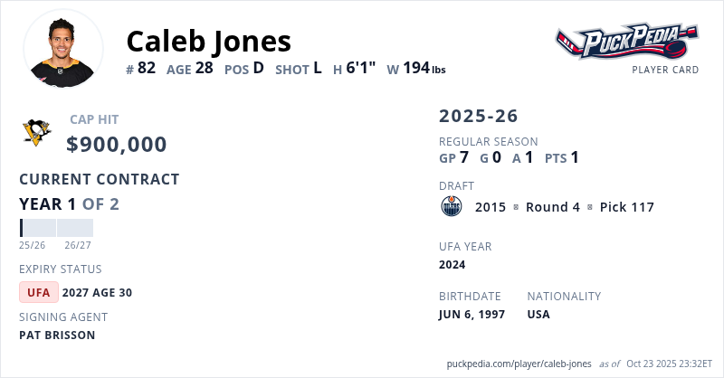 Caleb Jones is signed to a 2 year, $1,800,000 contract with a cap hit of $900,000 per season, playing for the Pittsburgh Penguins. His contract expires at the end of the 2026-27 season, making Jones an Unrestricted Free Agent.