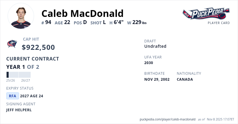 Caleb MacDonald is signed to a 2 year, $1,845,000 contract with a cap hit of $922,500 per season, playing for the Columbus Blue Jackets. His contract expires at the end of the 2026-27 season, making MacDonald a Restricted Free Agent.