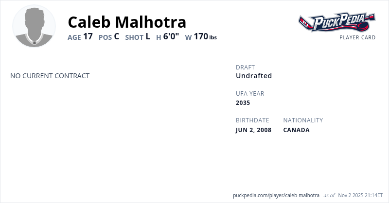 | 2024-25 | 16 | BCHL | Chilliwack Chiefs | 44 | 8 | 18 | 26 | 23 | Playoffs | 21 | 5 | 12 | 17 | 0 | ||||||||||||||||