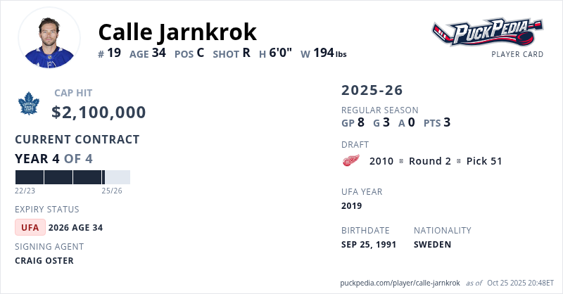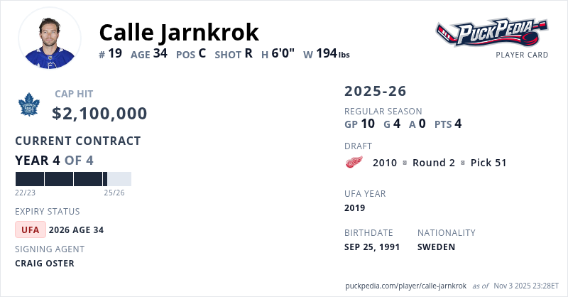 Calle Jarnkrok is signed to a 4 year, $8,400,000 contract with a cap hit of $2,100,000 per season, playing for the Toronto Maple Leafs. His contract expires at the end of the 2025-26 season, making Jarnkrok an Unrestricted Free Agent.