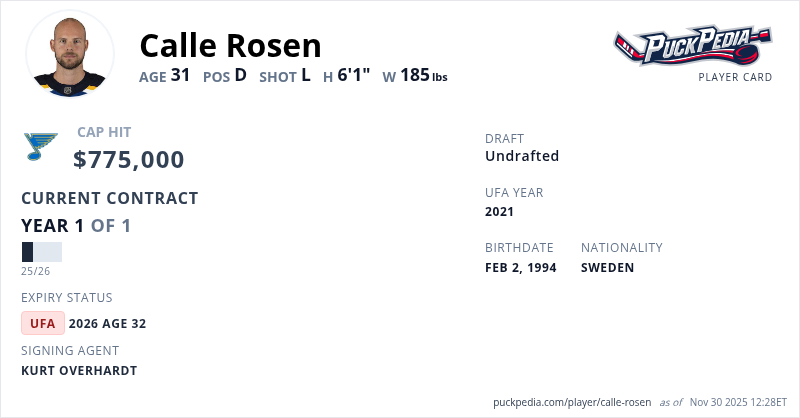 Calle Rosen is signed to a 1 year, $775,000 contract with a cap hit of $775,000 per season, playing for the St. Louis Blues. His contract expires at the end of the 2025-26 season, making Rosen an Unrestricted Free Agent.