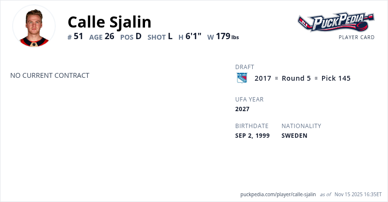 Calle Sjalin is an Unrestricted Free Agent (No Qualifying Offer). His last contract was 2 years, $1,710,000 with a cap hit of $855,000 per season. It expired at the end of the 2023-24 season.