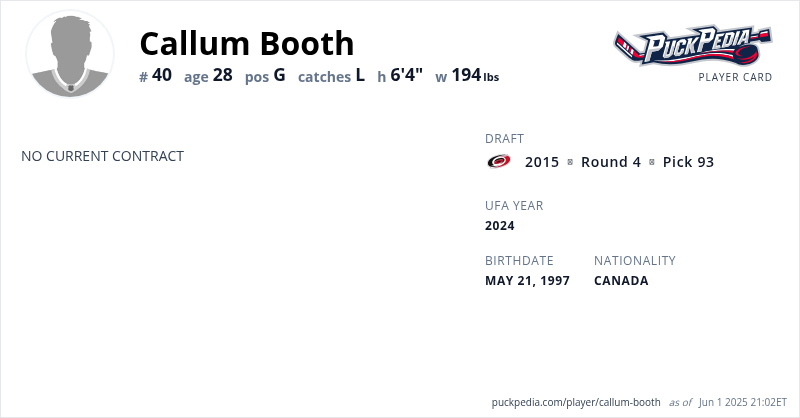 Callum Booth is an Unrestricted Free Agent. His last contract was 1 year, $750,000 with a cap hit of $750,000 per season. It expired at the end of the 2021-22 season.
