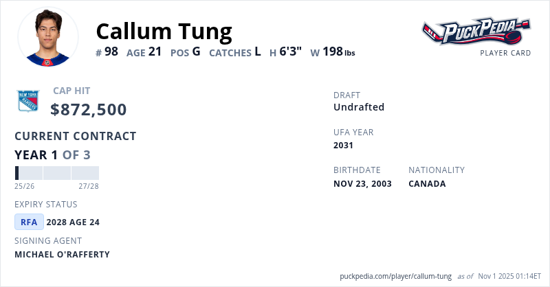 Callum Tung is signed to a 3 year, $2,617,500 contract with a cap hit of $872,500 per season, playing for the New York Rangers. His contract expires at the end of the 2027-28 season, making Tung a Restricted Free Agent.
