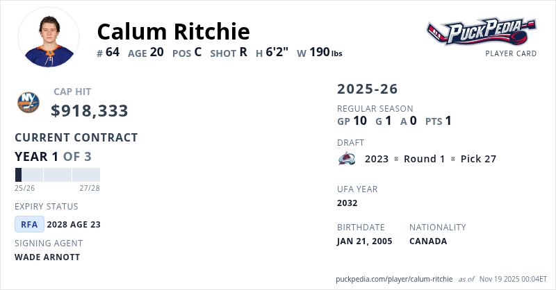 Calum Ritchie is signed to a 3 year, $2,754,999 contract with a cap hit of $918,333 per season, playing for the New York Islanders. His contract expires at the end of the 2027-28 season, making Ritchie a Restricted Free Agent.