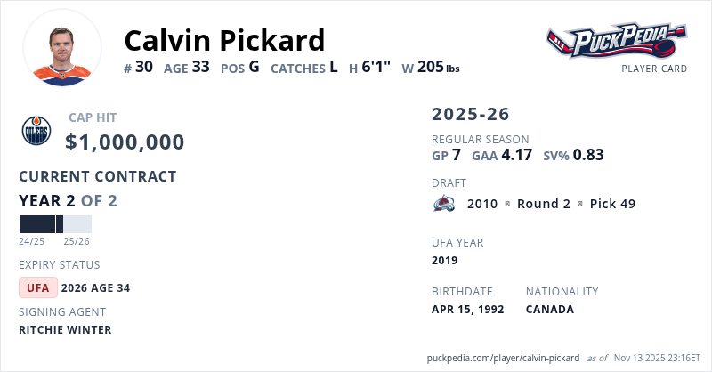Calvin Pickard is signed to a 2 year, $2,000,000 contract with a cap hit of $1,000,000 per season, playing for the Edmonton Oilers. His contract expires at the end of the 2025-26 season, making Pickard an Unrestricted Free Agent.