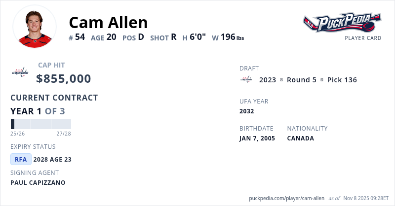 Cam Allen is signed to a 3 year, $2,565,000 contract with a cap hit of $855,000 per season, playing for the Washington Capitals. His contract expires at the end of the 2027-28 season, making Allen a Restricted Free Agent.