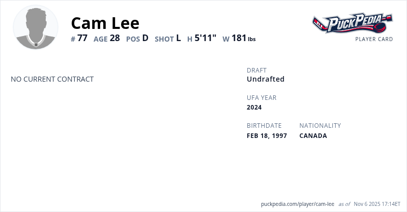 Cam Lee is an Unrestricted Free Agent (No Qualifying Offer). His last contract was 2 years, $1,850,000 with a cap hit of $925,000 per season. It expired at the end of the 2021-22 season.