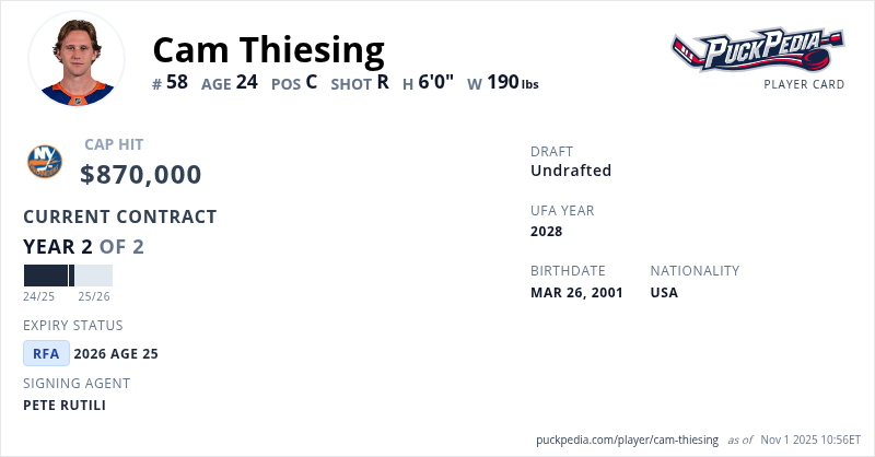 Cam Thiesing is signed to a 2 year, $1,740,000 contract with a cap hit of $870,000 per season, playing for the New York Islanders. His contract expires at the end of the 2025-26 season, making Thiesing a Restricted Free Agent.