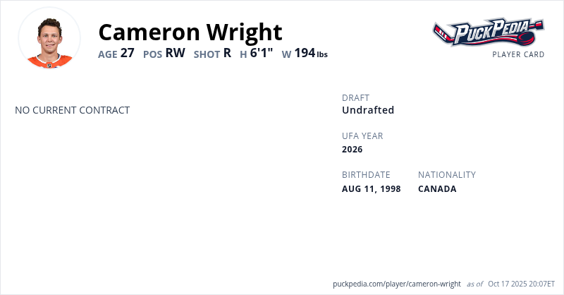 Cameron Wright is an Unrestricted Free Agent (No Qualifying Offer). His last contract was 1 year, $952,000 with a cap hit of $952,000 per season. It expired at the end of the 2024-25 season.