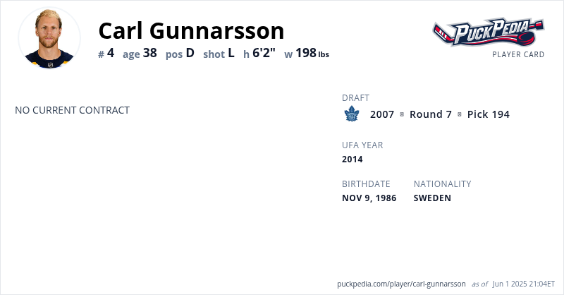 Carl Gunnarsson is an Unrestricted Free Agent. His last contract was 2 years, $3,500,000 with a cap hit of $1,750,000 per season. It expired at the end of the 2020-21 season.