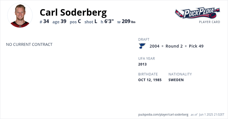 Carl Soderberg is an Unrestricted Free Agent. His last contract was 1 year, $1,000,000 with a cap hit of $1,000,000 per season. It expired at the end of the 2020-21 season.