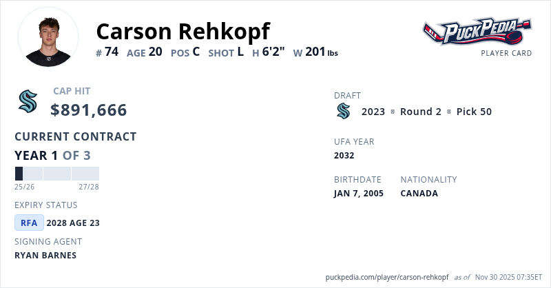 Carson Rehkopf is signed to a 3 year, $2,674,998 contract with a cap hit of $891,666 per season, playing for the Seattle Kraken. His contract expires at the end of the 2027-28 season, making Rehkopf a Restricted Free Agent.
