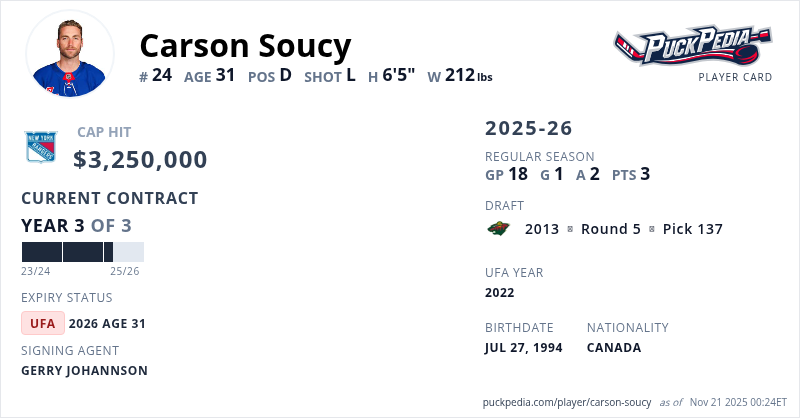 Carson Soucy is signed to a 3 year, $9,750,000 contract with a cap hit of $3,250,000 per season, playing for the New York Rangers. His contract expires at the end of the 2025-26 season, making Soucy an Unrestricted Free Agent.