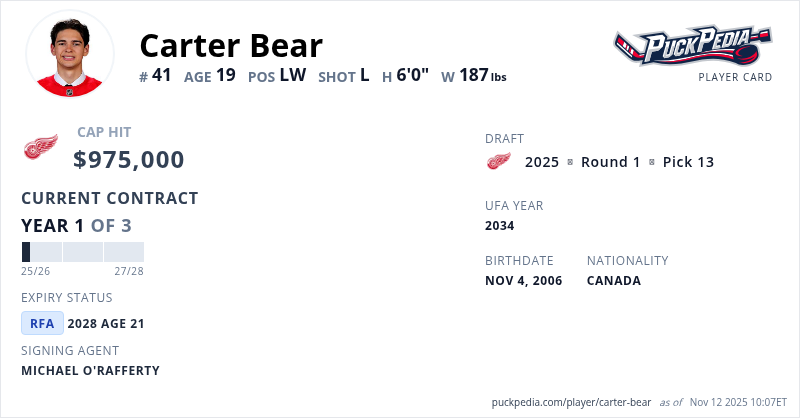 Carter Bear is signed to a 3 year, $2,925,000 contract with a cap hit of $975,000 per season, playing for the Detroit Red Wings. His contract expires at the end of the 2027-28 season, making Bear a Restricted Free Agent.