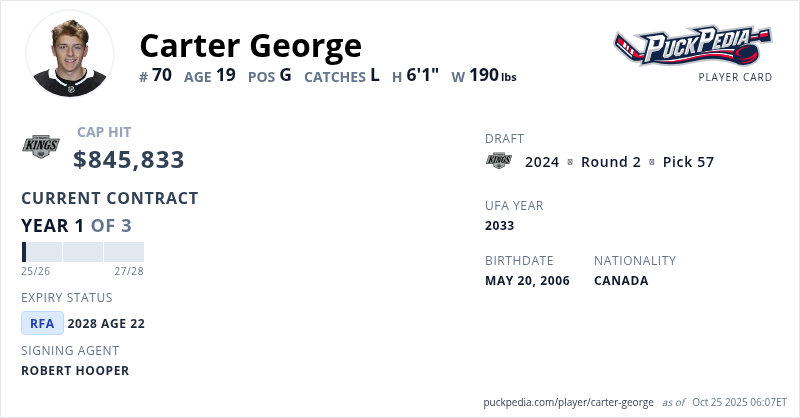 Carter George is signed to a 3 year, $2,537,499 contract with a cap hit of $845,833 per season, playing for the Los Angeles Kings. His contract expires at the end of the 2027-28 season, making George a Restricted Free Agent.