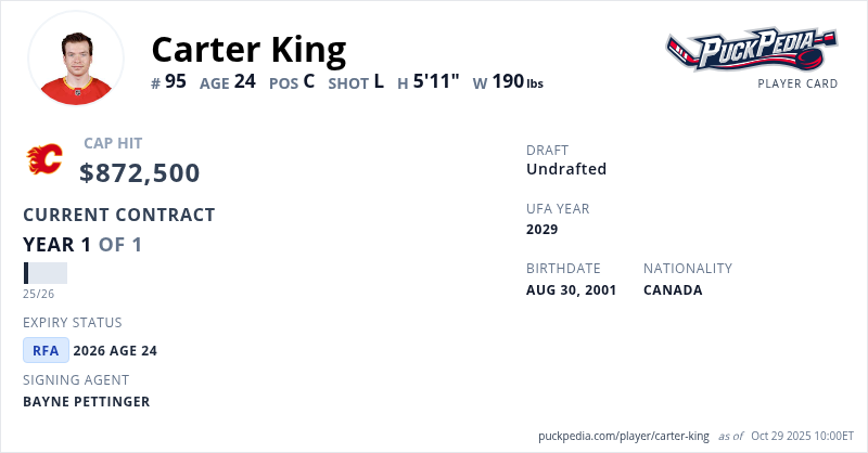 Carter King is signed to a 1 year, $872,500 contract with a cap hit of $872,500 per season, playing for the Calgary Flames. His contract expires at the end of the 2025-26 season, making King a Restricted Free Agent.