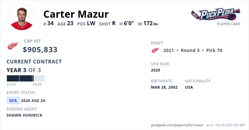 Carter Mazur is signed to a 3 year, $2,717,499 contract with a cap hit of $905,833 per season, playing for the Detroit Red Wings. His contract expires at the end of the 2025-26 season, making Mazur a Restricted Free Agent.