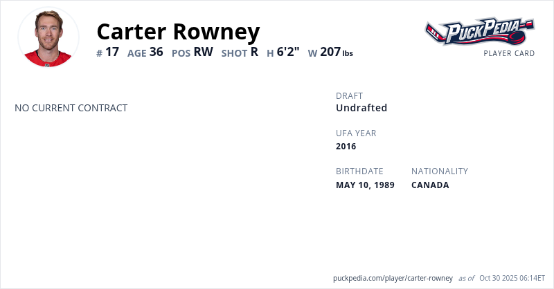 Carter Rowney is an Unrestricted Free Agent. His last contract was 1 year, $825,000 with a cap hit of $825,000 per season. It expired at the end of the 2021-22 season.