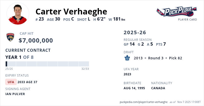 Carter Verhaeghe is signed to a 8 year, $56,000,000 contract with a cap hit of $7,000,000 per season, playing for the Florida Panthers. His contract expires at the end of the 2032-33 season, making Verhaeghe an Unrestricted Free Agent.