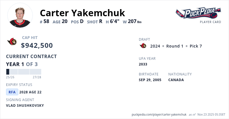 Carter Yakemchuk is signed to a 3 year, $2,827,500 contract with a cap hit of $942,500 per season, playing for the Ottawa Senators. His contract expires at the end of the 2027-28 season, making Yakemchuk a Restricted Free Agent.