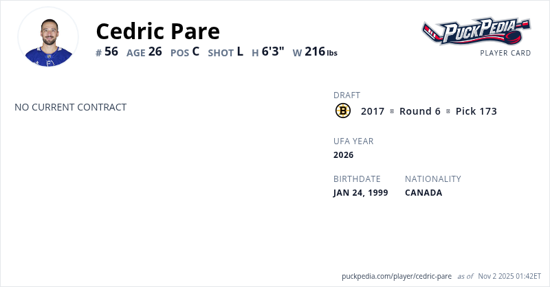 Cedric Pare is an Unrestricted Free Agent (No Qualifying Offer). His last contract was 1 year, $775,000 with a cap hit of $775,000 per season. It expired at the end of the 2024-25 season.