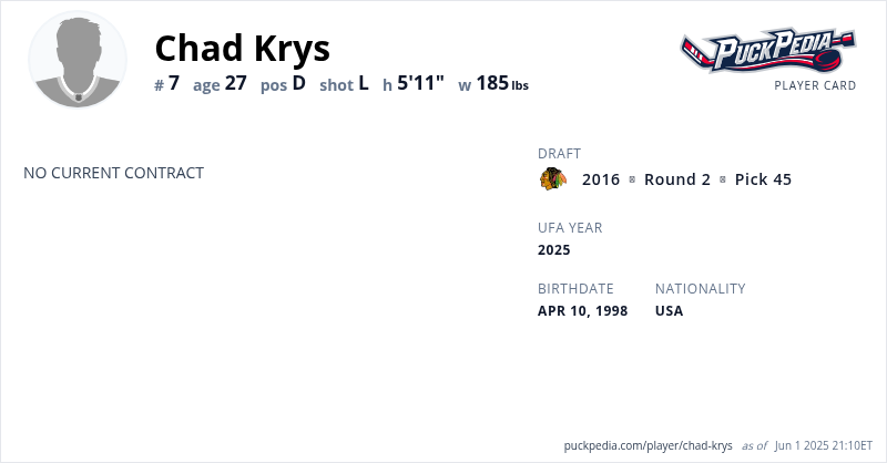 Chad Krys is an Unrestricted Free Agent (No Qualifying Offer). His last contract was 3 years, $2,559,999 with a cap hit of $853,333 per season. It expired at the end of the 2021-22 season.