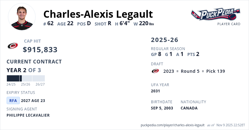 Charles-Alexis Legault is signed to a 3 year, $2,747,499 contract with a cap hit of $915,833 per season, playing for the Carolina Hurricanes. His contract expires at the end of the 2026-27 season, making Legault a Restricted Free Agent.